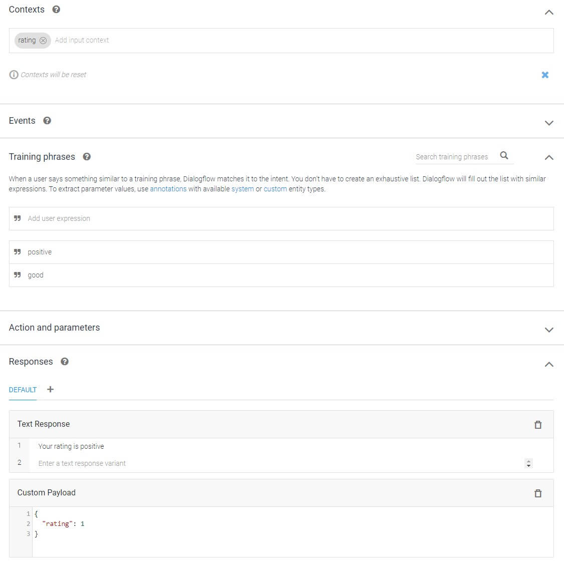 and { "rating": 1, "force-message": true } as Custom Payload response. For the negative rating create a new intent with same context but replace the training phrases and the custom payload to { "rating": -1, "force-message": true }. The shortcode must include also a title or message.